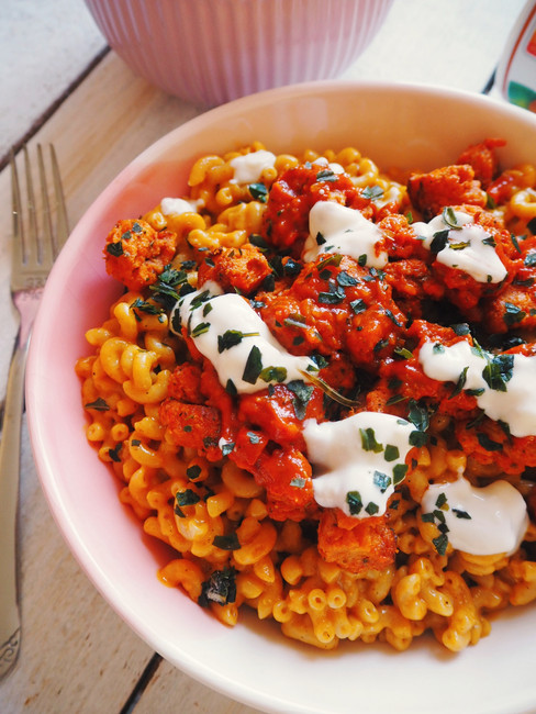 Moi et mon grand amour pour les mac & cheese... Ce plat tellement réconfortant, décadent et gourmand ! Aujourd'hui je vous propose une délicieuse déclinaison du Mac & Cheese façon Buffalo "Chicken". Un mac & Cheese one pot agrémenté de protéines de soja texturé façon buffalo....irrésistible. Croyez-moi vous allez y revenir !